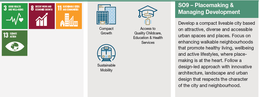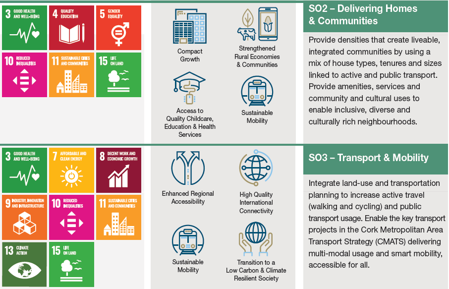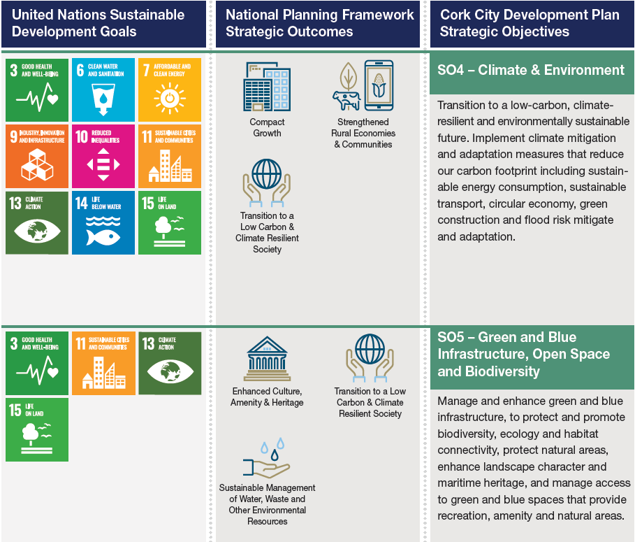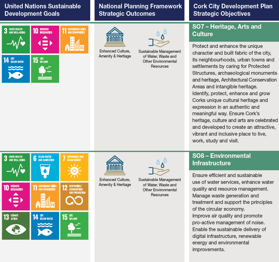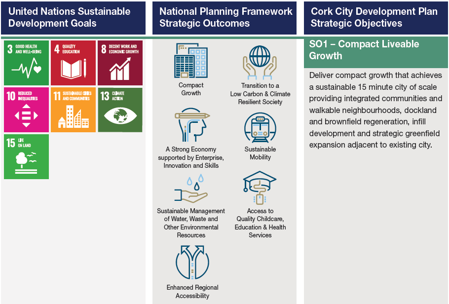 This Plan sets out 9 Strategic Objectives to guide development in the City. These Strategic Objectives generally reflect the various Chapters set out in this Plan and are addressed in Chapter 2. However, the following tables set out how these 9 Strategic Objectives align with the United Nations Sustainable Development Goals and the National Strategic Outcomes of the National Planning