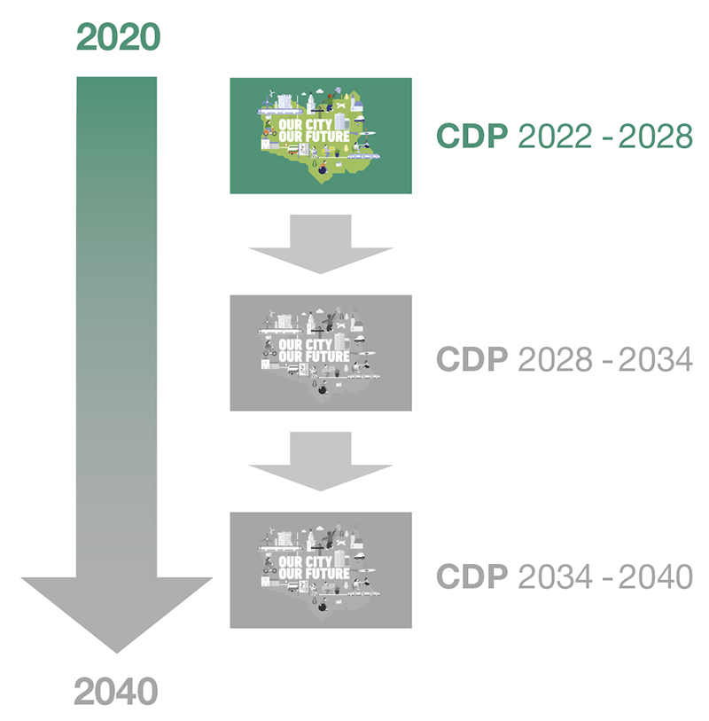 This City Development Plan is the key land use and strategic planning strategy to guide the development of Cork City to achieve this strategic vision. The City Development Plan 2022 – 2028 will be the first development plan of a three-plan cycle up to 2040, the horizon year of the National Planning Framework. This Plan therefore represents the first step in achieving the ambitions of the National Planning Framework.