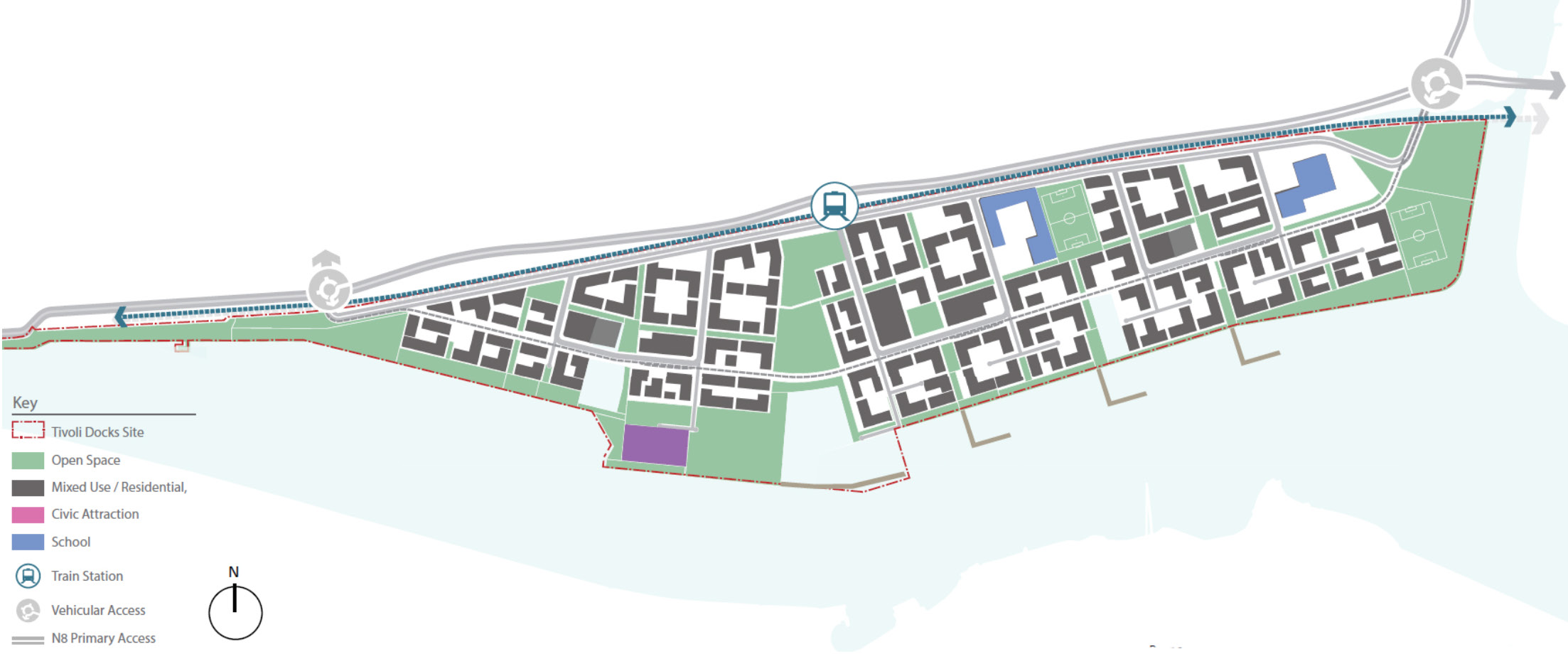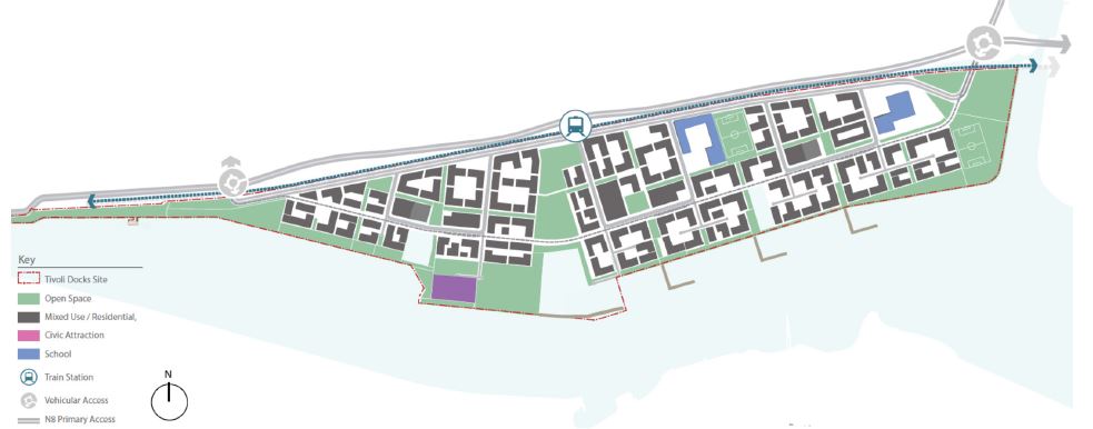 residential, school, local shops, community centre, open space and residential (potentially 1,360 homes) road bridge access.