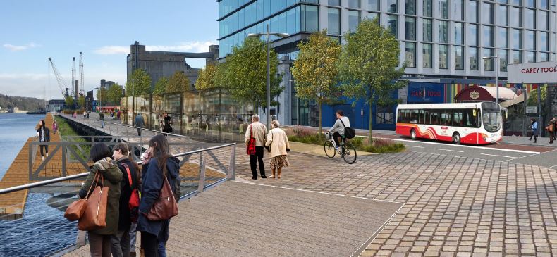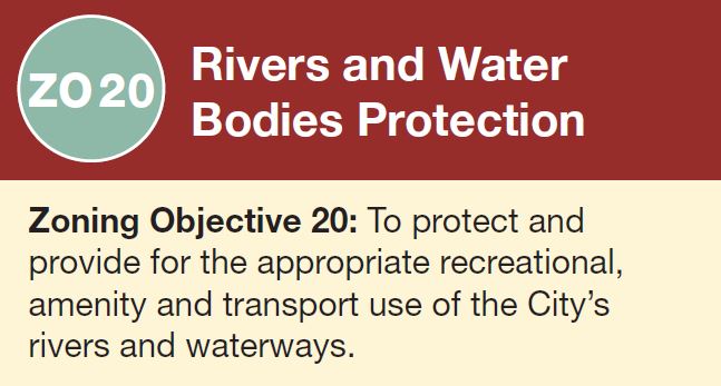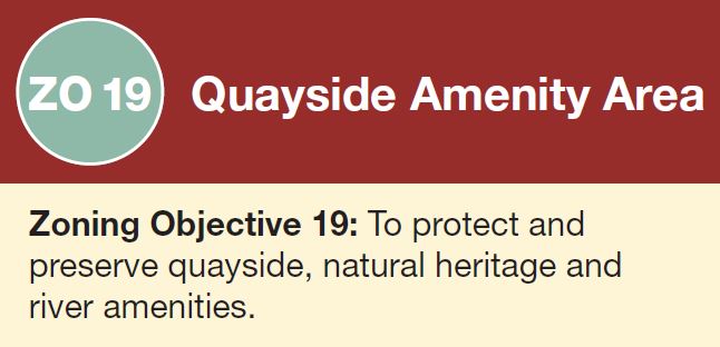 This zoning objective applies to the quayside area in the City Centre and City Docks, north and south. Development in this zone is limited to public realm improvements, quayside amenity, landscaping, walkways and cycleways. Elements of public art will be actively encouraged along these walkways, with information and wayfinding signage permissible subject to local considerations. Water based activities will be encouraged.