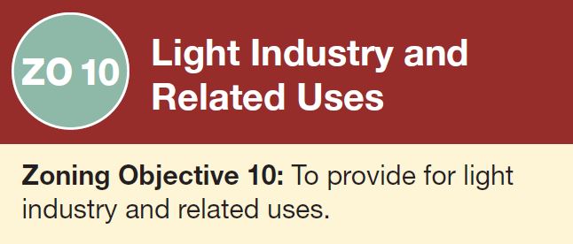 The main purpose of this zoning objective is to provide for and protect dynamic light industry and manufacturing employment areas. Primary uses in this zone where the primary activity is the manu-facturing of a physical product and which activity is compatible with being located near to residential areas. Primary uses include light industry; small to medium sized manufacturing and repairs; wholesaling; trade showrooms; retail showrooms where ancillary to manufacturing, fitting and business to business activity; car showrooms; and incubator units. Other uses may include warehousing, logistics, storage and distribution, subject to local considerations. Offices ancillary to the main light industry, manufacturing or employment use are also acceptable.