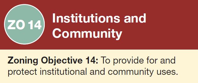 The main purpose of this zone is to provide for the wide range of education facilities, generally comprising primary and post primary schools and third-level education facilities. This zone accommodates all ancillary accommodation, facilities and development serving educational facilities, including sports facilities and playing fields and associated development.