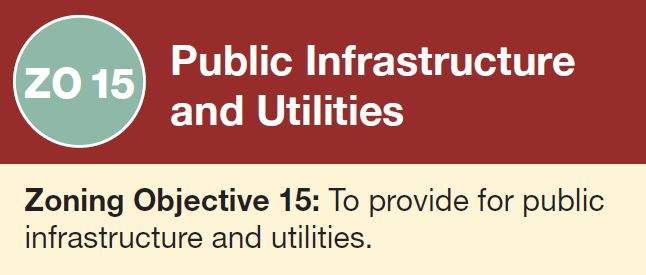 This zone covers the provision of public and utilities infrastructure, which can include park and ride facilities, and various other transport, water, drainage, emergency services, electricity, gas, telecommunications, maintenance purposes and other utility facilities.