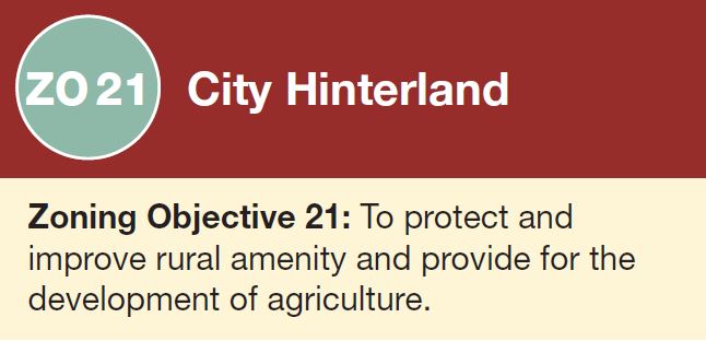 The primary objective of this zone is to preserve the character of the City Hinterland generally for use as agriculture, rural amenity, open space, recreational uses, green and blue infrastructure and to protect and enhance biodiversity. Rural-related business activities which have a demonstrated need for a rural location are also permissible. Any development associated with such uses should not compromise the specific function and character of the City Hinterland in the particular area.
