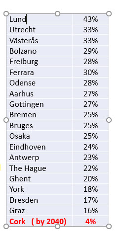 Target Figure . The target figure of 4% is based on CMATS data from 2011 census and this is also a target for the greater Metropolitan Area to 2040 , not the City Boundary Area up to 2028. The figure of 4% is a forecast modelling figure for 2040 CMATS area and not an ambitiuos target for 2028. 4% is also a step backwards from the stated target of 10% by 2020 under the National Cycle Policy Framework. The figure of 4% is very low comapred to second cities and similar size cites in other countries. A target of 20% for Cork is more aligned with our goals for a liveable 15-minute city, Climate Change and Environment Objectives, and a transition to a low carbon sustainable future as stated in the Core Strategy objectives. A stated target of 20% in the Active Travel Objective 4.4 is a measurable, time related and actionable objective that would require a active monitoring and progress reports at regular development plan review stages.