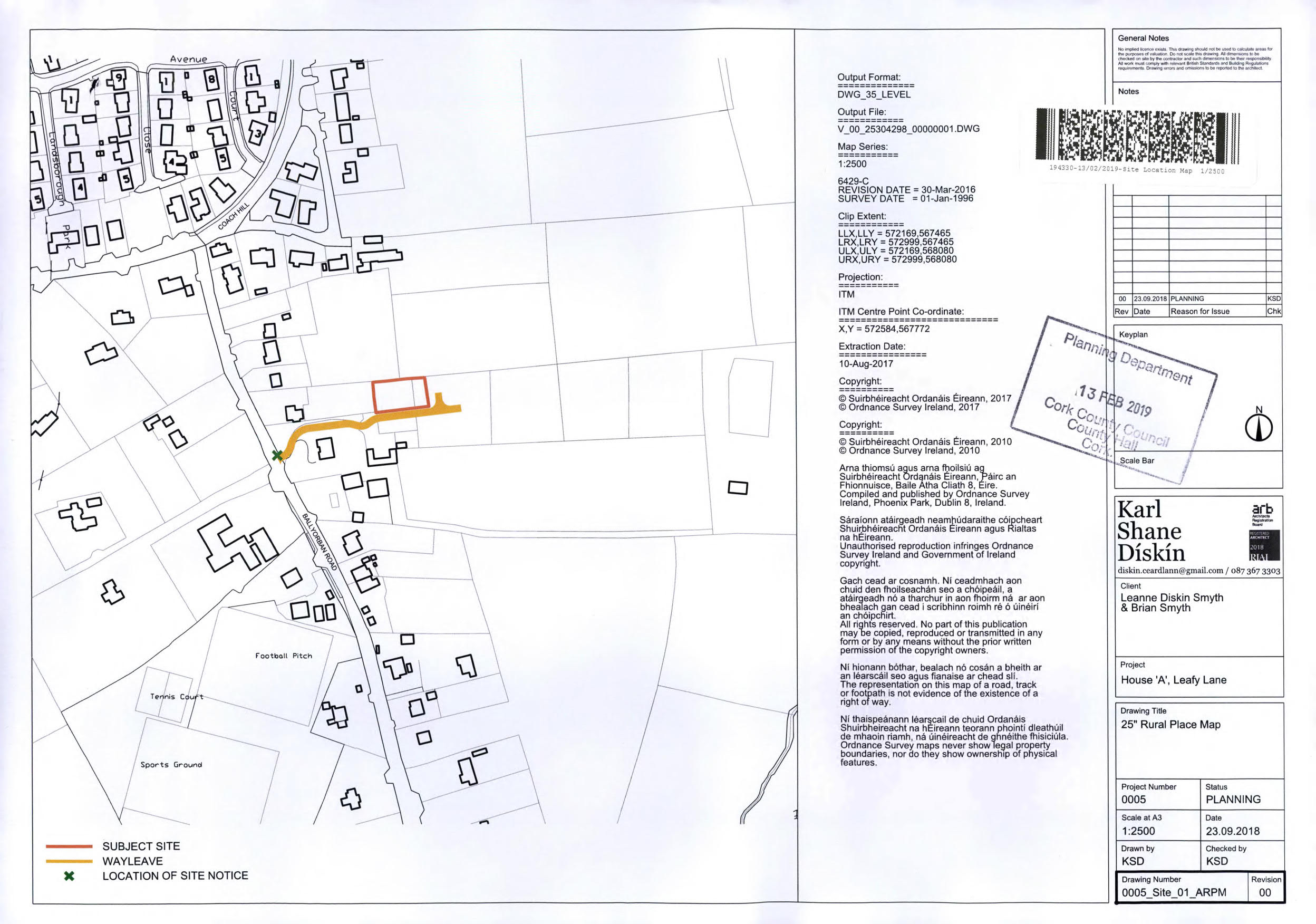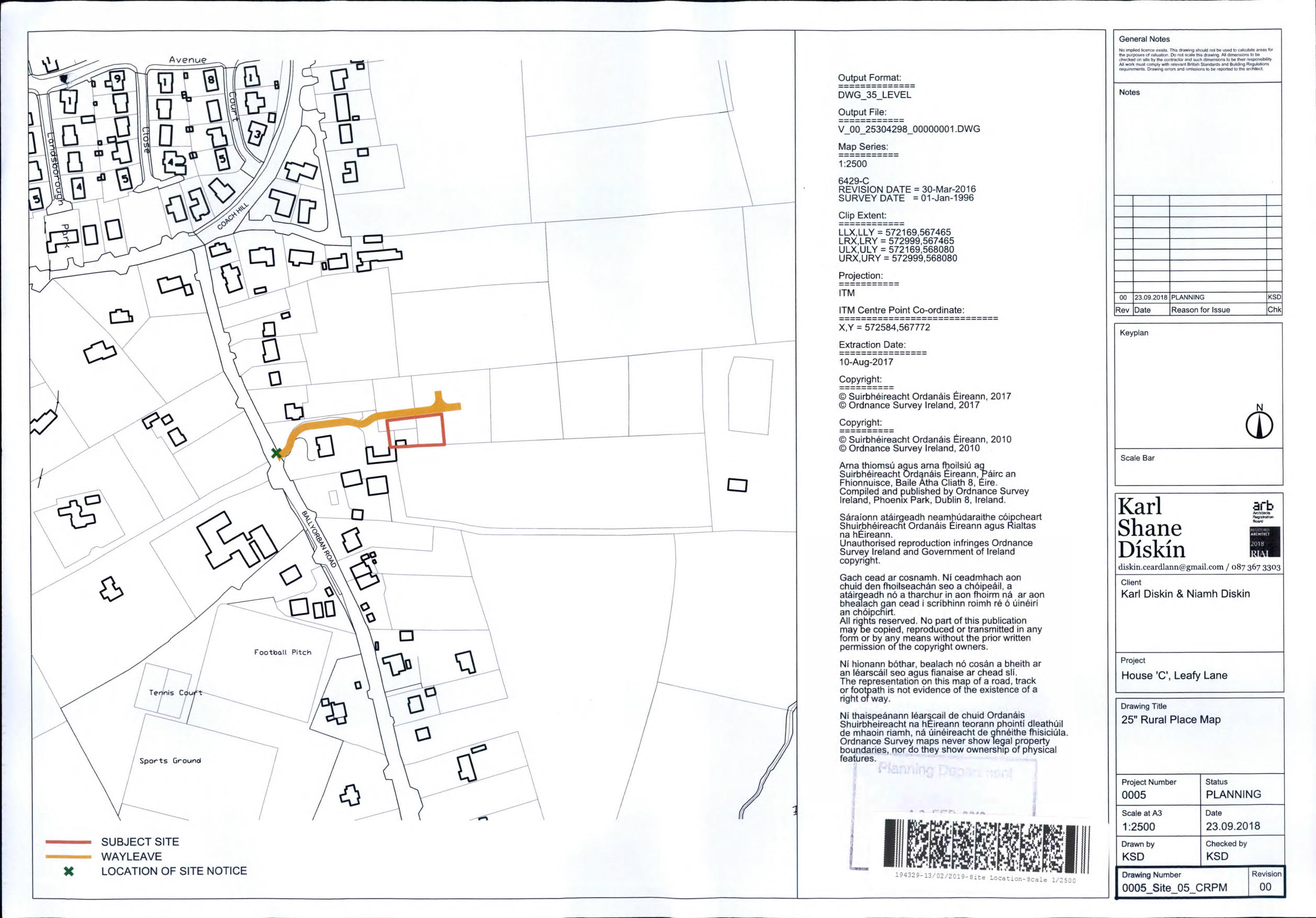 My name is Karl Diskin, I am a land owner in Moneygurney. In June 2019 I was granted full planning permission (ref. 19/4329) to build a residential house on my land. I have attached the site location plan for your information. I note that in the draft CCDP Vol 2, Map 14, the zoning map does not take account of my planning permission and indicates that more than half my residential development site is zoned for ZO 21 City Hinterland (green belt). This does not make any sense to me. The land is already granted planning permission for residential development by the City; why then would the City choose to zone it green belt two years later? My sister owns an adjacent plot of land (ref 19/4330) and faces the same issue.