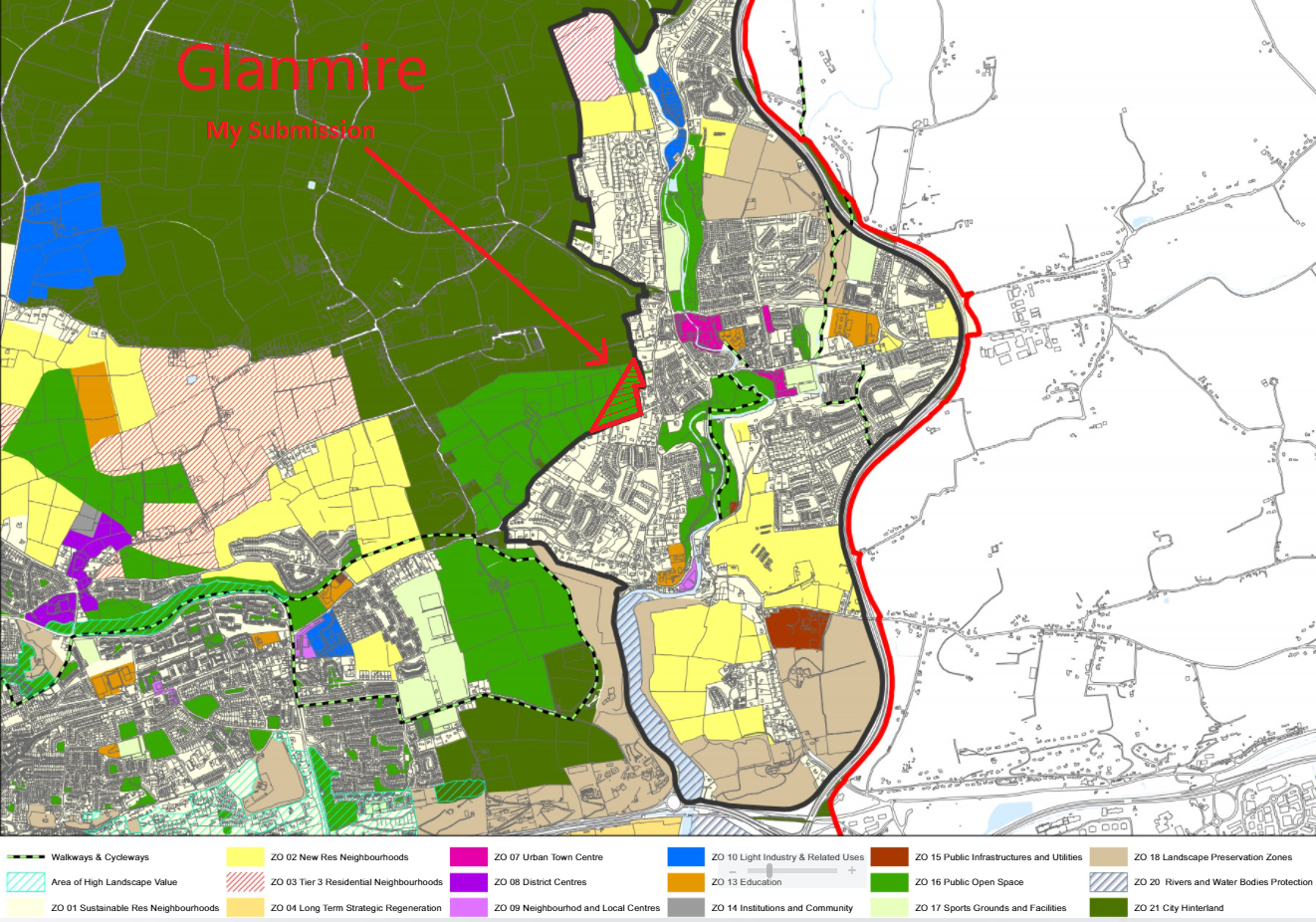 This submission is further to the earlier submission made in the ‘Pre-Plan Public Consultation’ stage championing the development of Glanmire as a ‘sustainable town’ within Cork City. Please see the attached map proposing land at the bottom of Barnavara Hill be developed as medium-high density mixed-type housing. The many merits of this development are as follows: