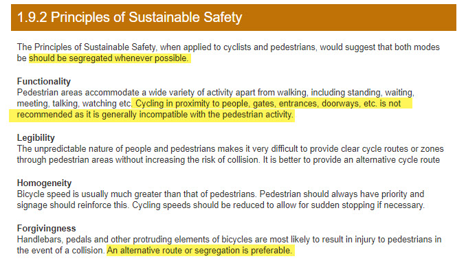 Many examples exist of designs that create conflict between pedestrian and cyclists. Cycle lanes which direct cyclists onto footpaths should be redesigned to be in accordance with highest possible design standards in the National Cycle Manual or preferably best international practice. The disjointed nature of cycle lanes and lack of a coherent network is a barrier to cycling for many.